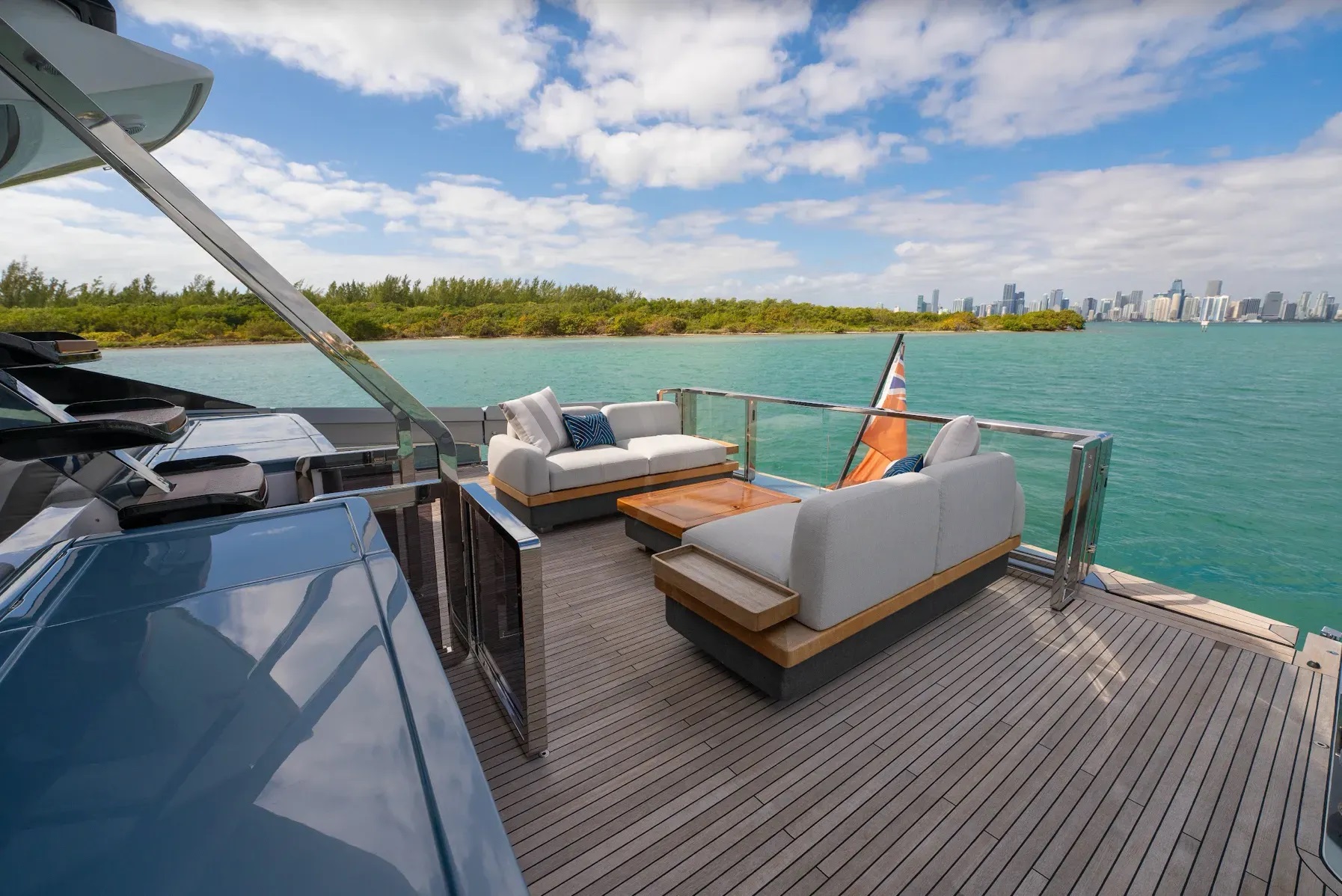 NOTABLE FEATURES OF LATITUDE: ~Hard roof over the sun deck ~Open aft cockpit ~Cool, ice blue hull ~38 knot top speed ~Tender and toys ~Air conditioning ~WiFi