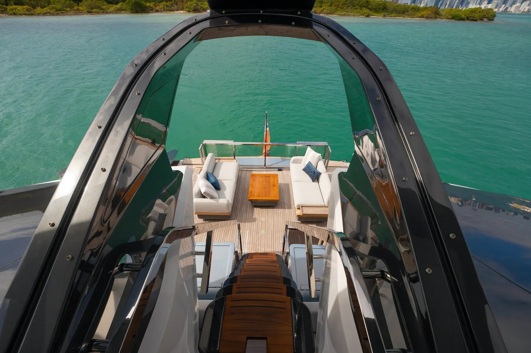 NOTABLE FEATURES OF LATITUDE: ~Hard roof over the sun deck ~Open aft cockpit ~Cool, ice blue hull ~38 knot top speed ~Tender and toys ~Air conditioning ~WiFi