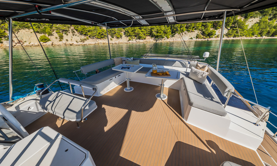 A great open plan layout seamlessly connects the interior and exterior while the lower deck offers accommodation for up to ten guests in a five-cabin layout. Two crew members will look after guests for the duration of the charter.