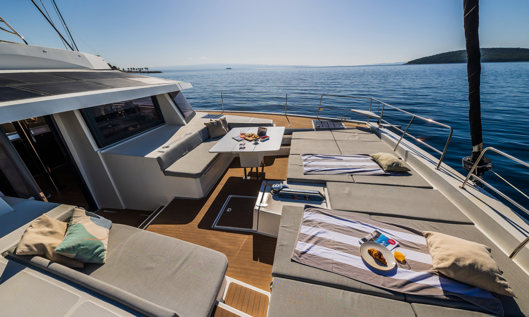The foredeck is also accessible from the main salon and presents guests with a relaxing terrace from where to enjoy the surroundings. A wide row of sun pads is forward and a flexible lounge/dining area aft.