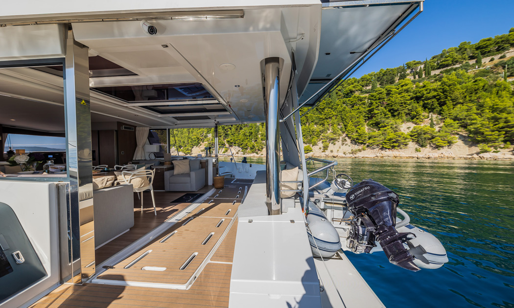 A great open plan layout seamlessly connects the interior and exterior while the lower deck offers accommodation for up to ten guests in a five-cabin layout. Two crew members will look after guests for the duration of the charter.