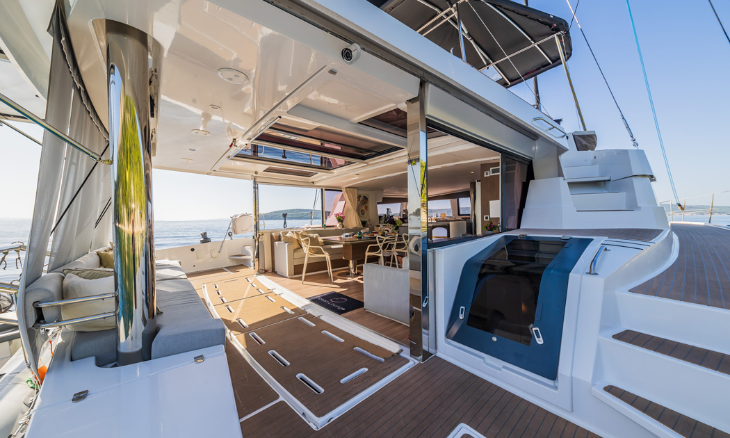 Living space on board flows seamlessly between the exterior and interior with the main deck cockpit leading directly into the main salon.