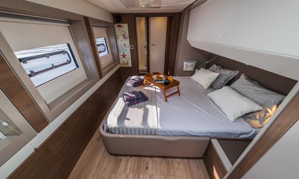 The five-cabin layout includes one king, three doubles and one twin suite, all the with luxury and privacy of ensuite bathroom facilities. The aft suites offer private access from the aft cockpit while the other suites are accessed from the main salon.
