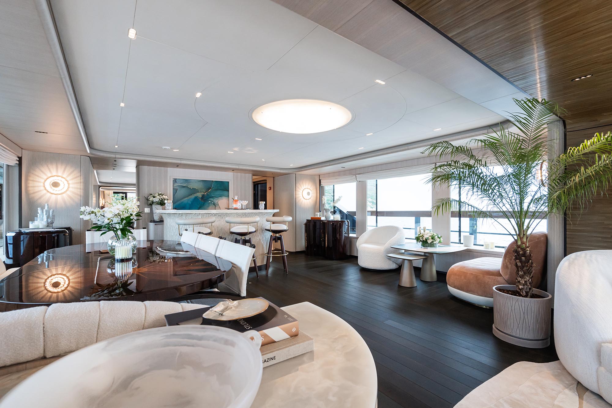 The main salon is a more formal space with custom-made furnishings create a lounge aft and dining room and bar forward. The elegantly curved sofas in the lounge surround a coffee table and doors lead out to the side decks really bringing the outdoors in.