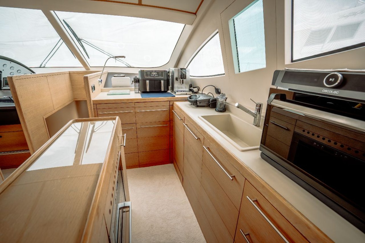 The main salon leads directly from the aft cockpit and is split level, including a lounge on the lower level and dining, galley and helm on the upper level. The lounge boasts a corner sofa and opposing three-seater while the dining table can seat everyone on board.