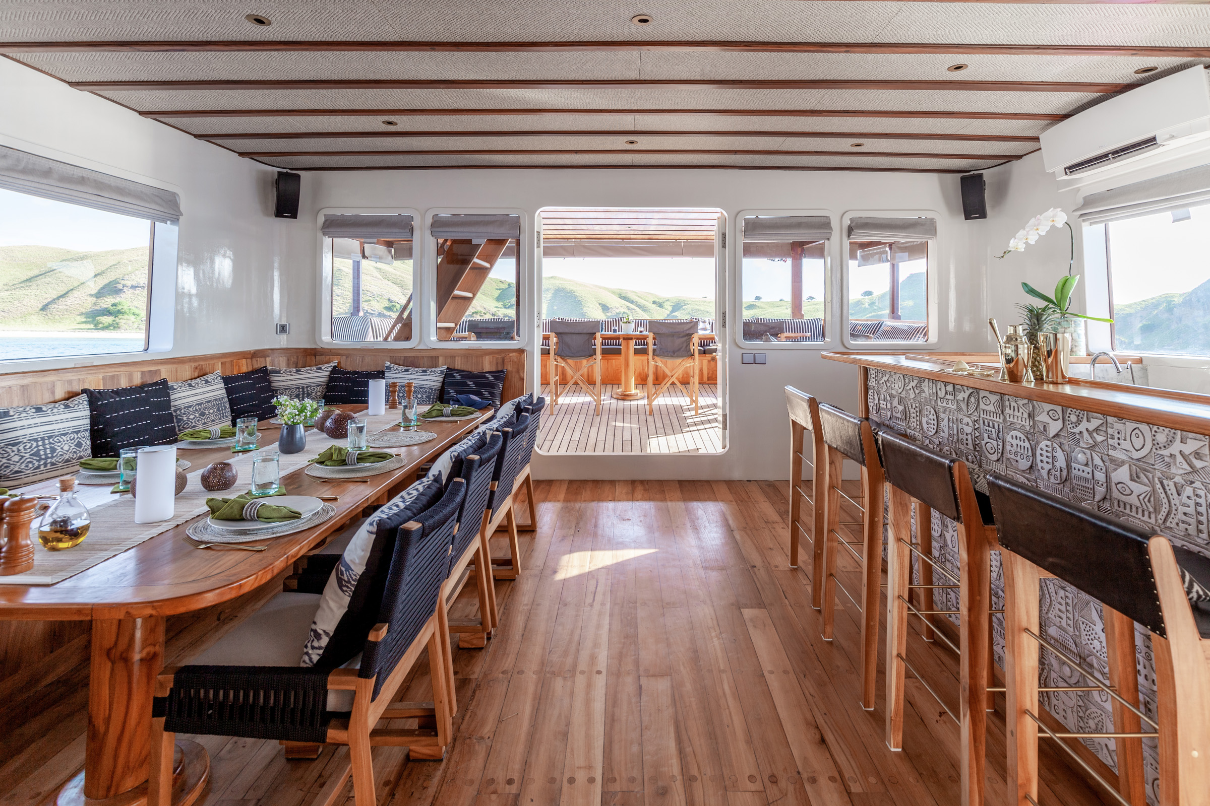 The wood panelling in the main salon creates a welcoming atmosphere and space is configured with a large dining setting and sit up bar – cocktails at sundown are a must. The generous wine cellar and well-equipped galley ensure guests enjoy a top-quality dining experience while on board.