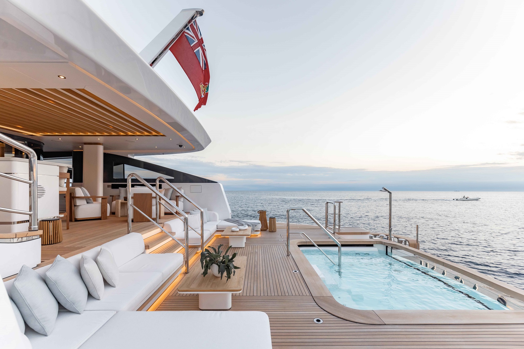 Her Oasis deck is an expansive beach terrace, unique to Benetti which includes a glass fronted pool. She can accommodate up to 10 guests in 5 suites with additional cabins for the 12 crew members.
