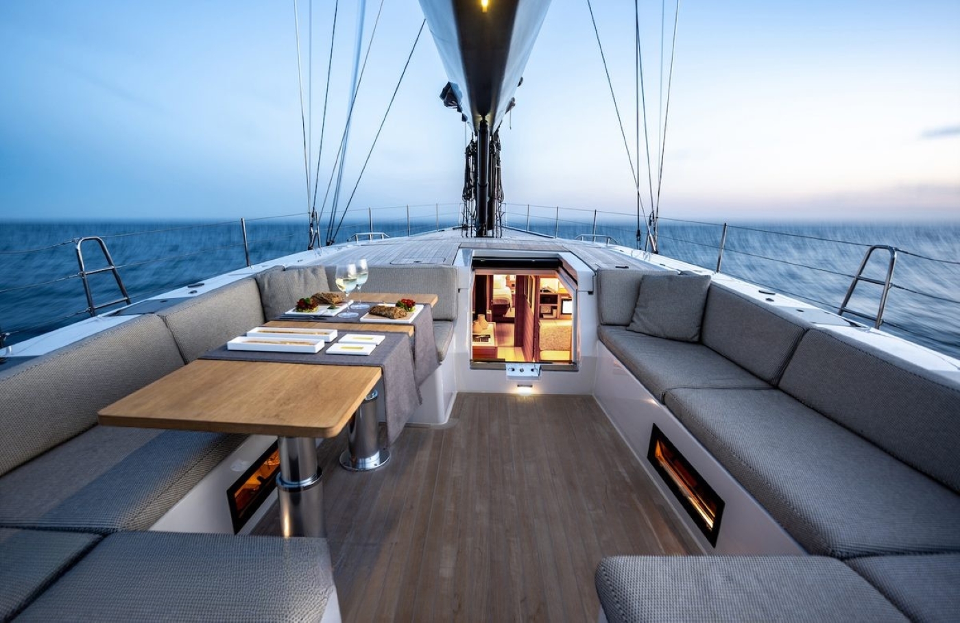 The yacht is characterised by her clean lines, flush deck and unique teal hull.