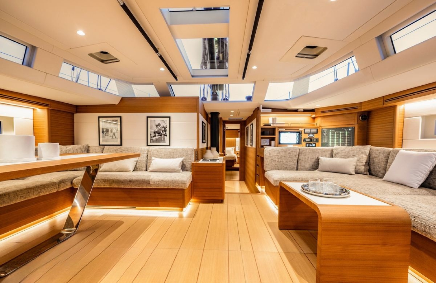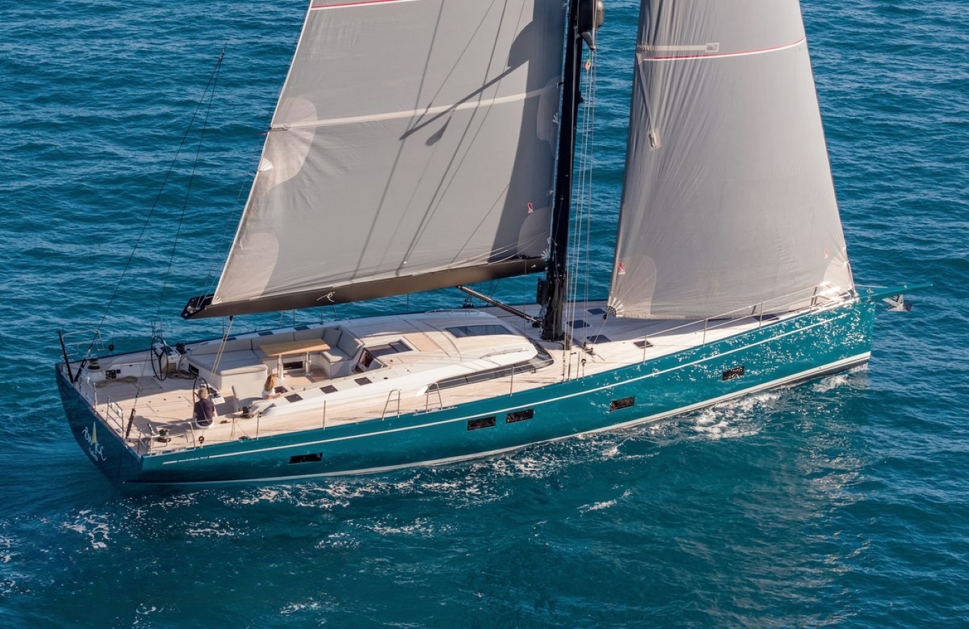 The yacht is characterised by her clean lines, flush deck and unique teal hull.