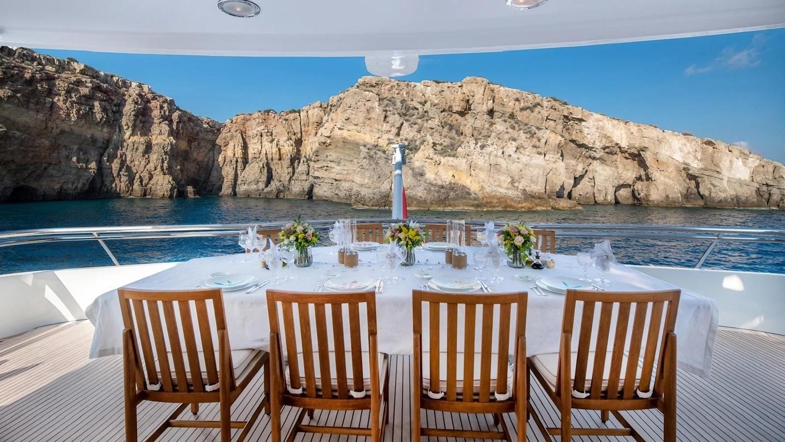 The upper deck aft is dedicated to al fresco dining with a large table which can be moved from the sunny aft position to a more sheltered spot under the sun deck overhang.