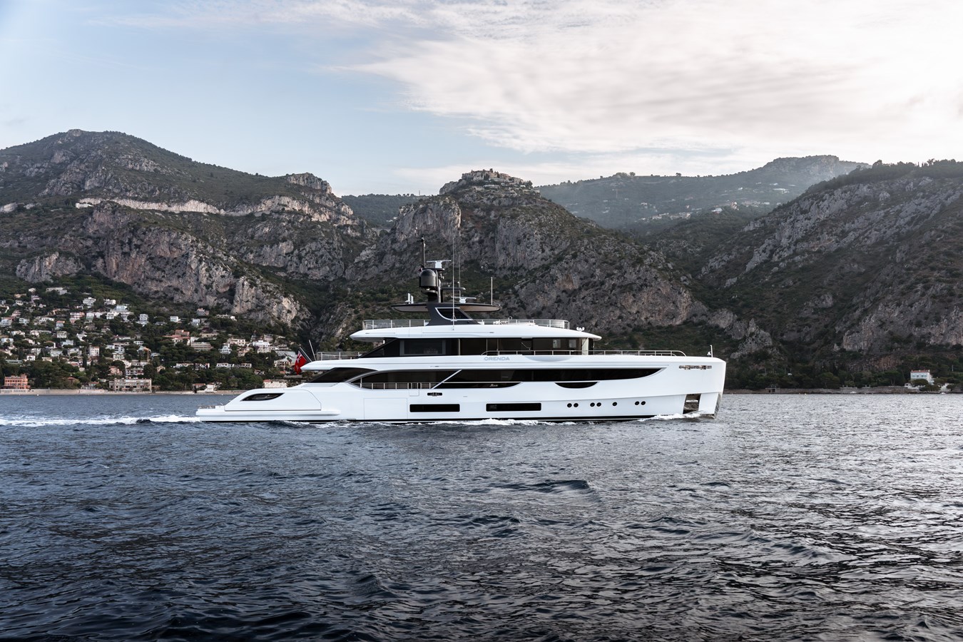 Orenda) featuring exterior design from RWD and interiors by Bonetti/Kozerski Architecture. The 2024 built yacht is characterised by the large, aft Oasis deck and has plenty of exterior entertainment space including a glass-fronted pool on the beach terrace and a circular jacuzzi on the sun deck.