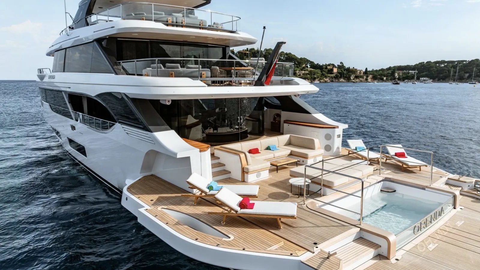 The 2024 built yacht is characterised by the large, aft Oasis deck and has plenty of exterior entertainment space including a glass-fronted pool on the beach terrace and a circular jacuzzi on the sun deck. A five-suite layout can accommodate up to ten guests while additional cabins are home to the eight crew members.