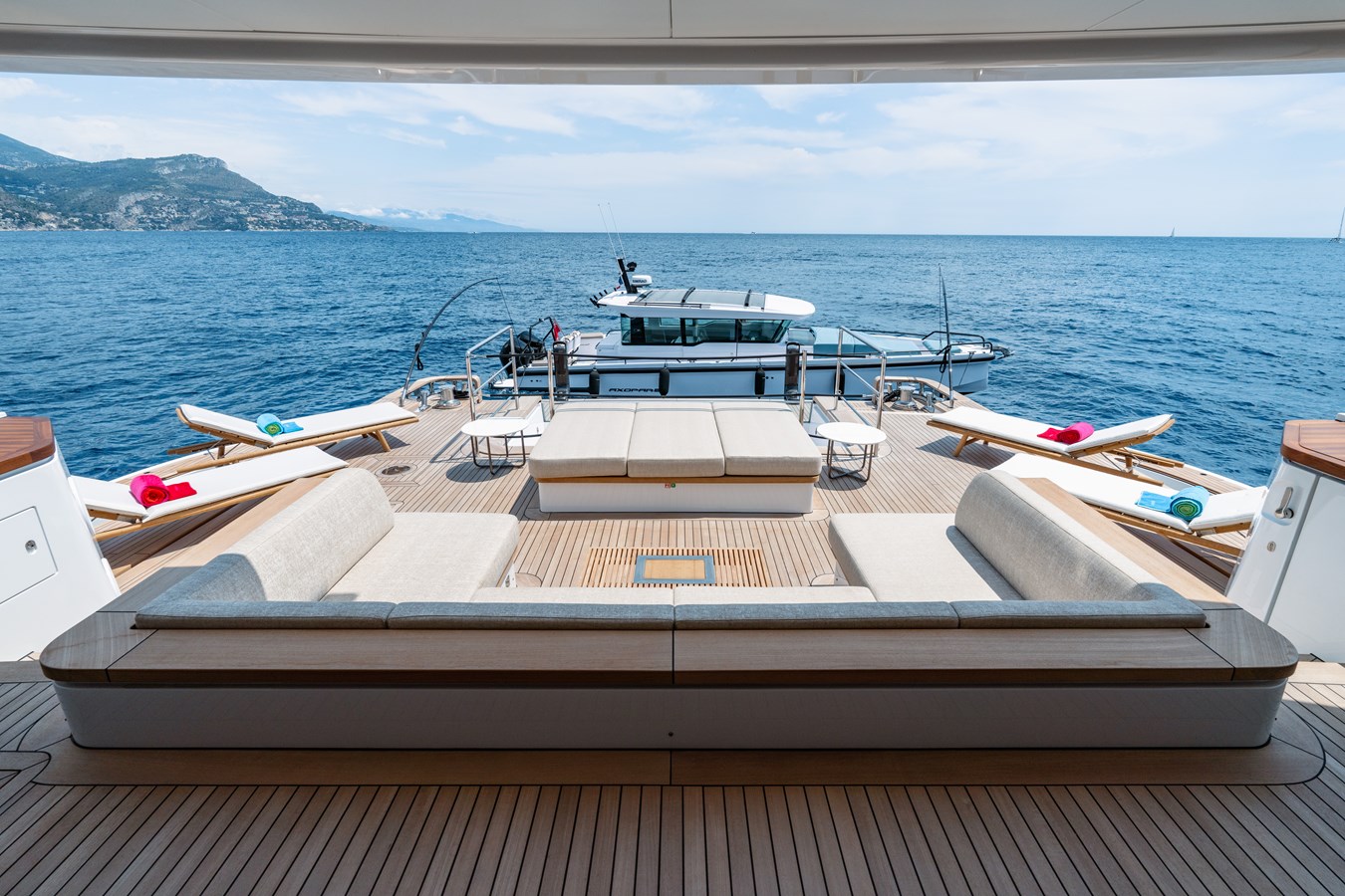 The 2024 built yacht is characterised by the large, aft Oasis deck and has plenty of exterior entertainment space including a glass-fronted pool on the beach terrace and a circular jacuzzi on the sun deck. A five-suite layout can accommodate up to ten guests while additional cabins are home to the eight crew members.