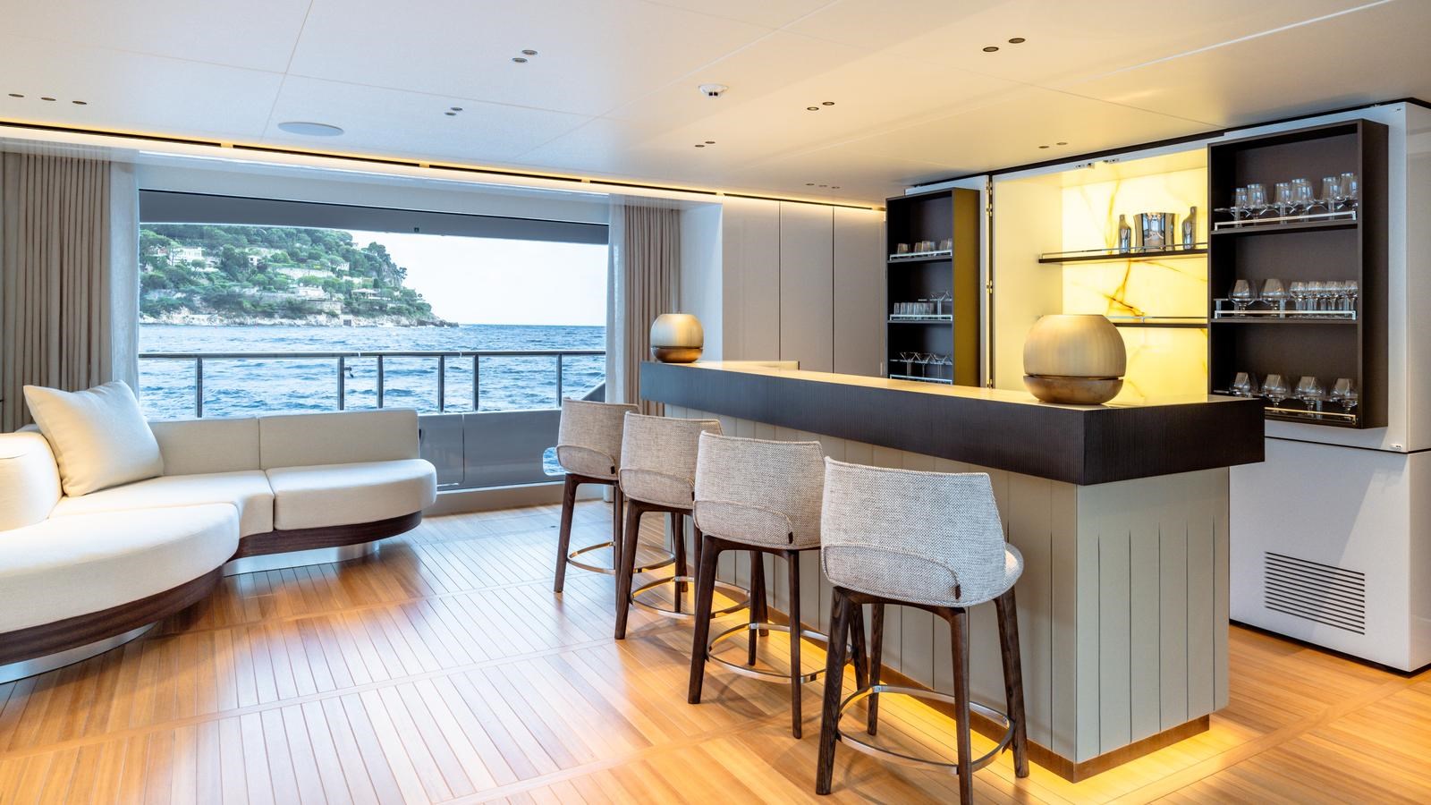 Custom built sofas curve along each side of the main salon providing ample seating for guests inside, while a backlit Onice marble bar is forward.