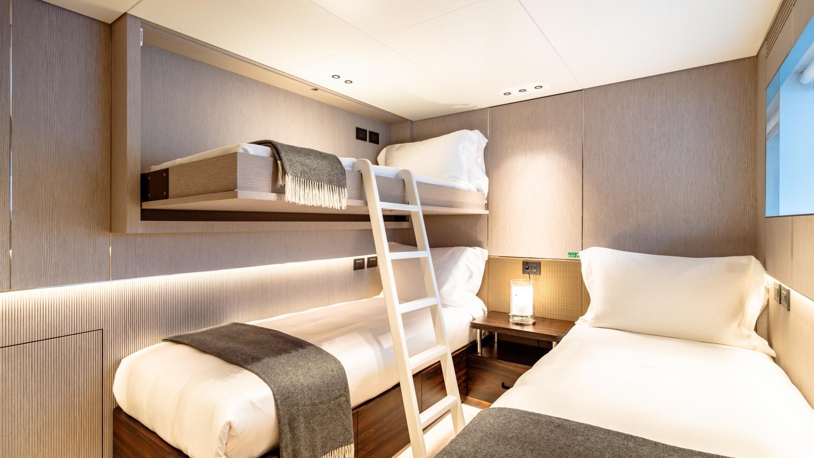 A five-suite layout can accommodate up to ten guests while additional cabins are home to the eight crew members.
