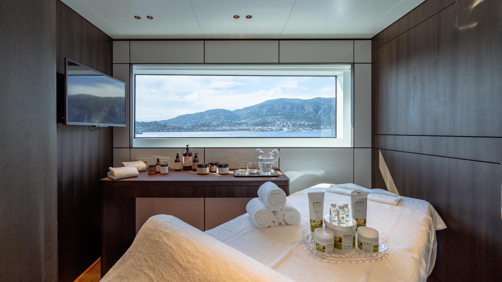 The 2024 built yacht is characterised by the large, aft Oasis deck and has plenty of exterior entertainment space including a glass-fronted pool on the beach terrace and a circular jacuzzi on the sun deck. A five-suite layout can accommodate up to ten guests while additional cabins are home to the eight crew members.