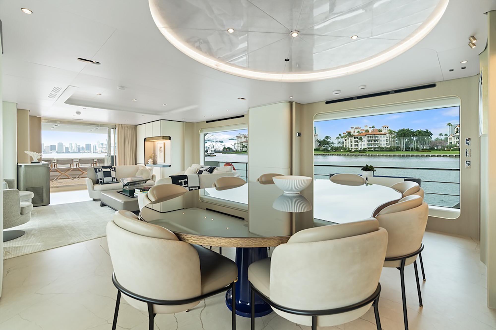 The sun deck is a multi-purpose space with lounge and sun pads aft, dining setting and sit up bar amidships and helm station forward. A hard roof with retractable section covers the deck and offers flexibility whatever the ...