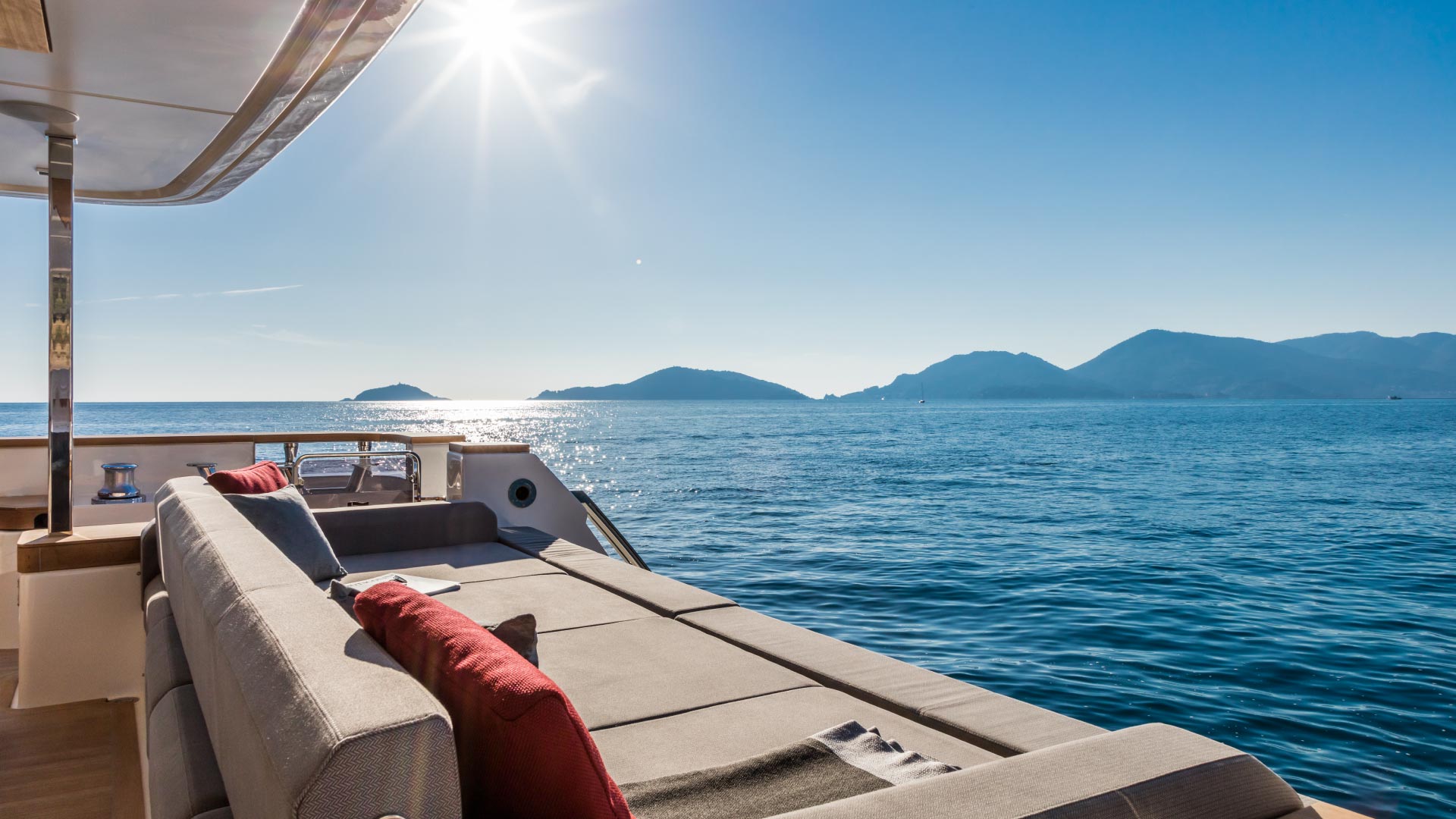 The upper deck aft is dedicated to dining and includes a large table and chairs - shaded by the sun deck overhang – and sofas/day beds open to the sun. On the foredeck there is a wide expanse of sun pads and a u-shaped sofa surrounding a flexible table.
