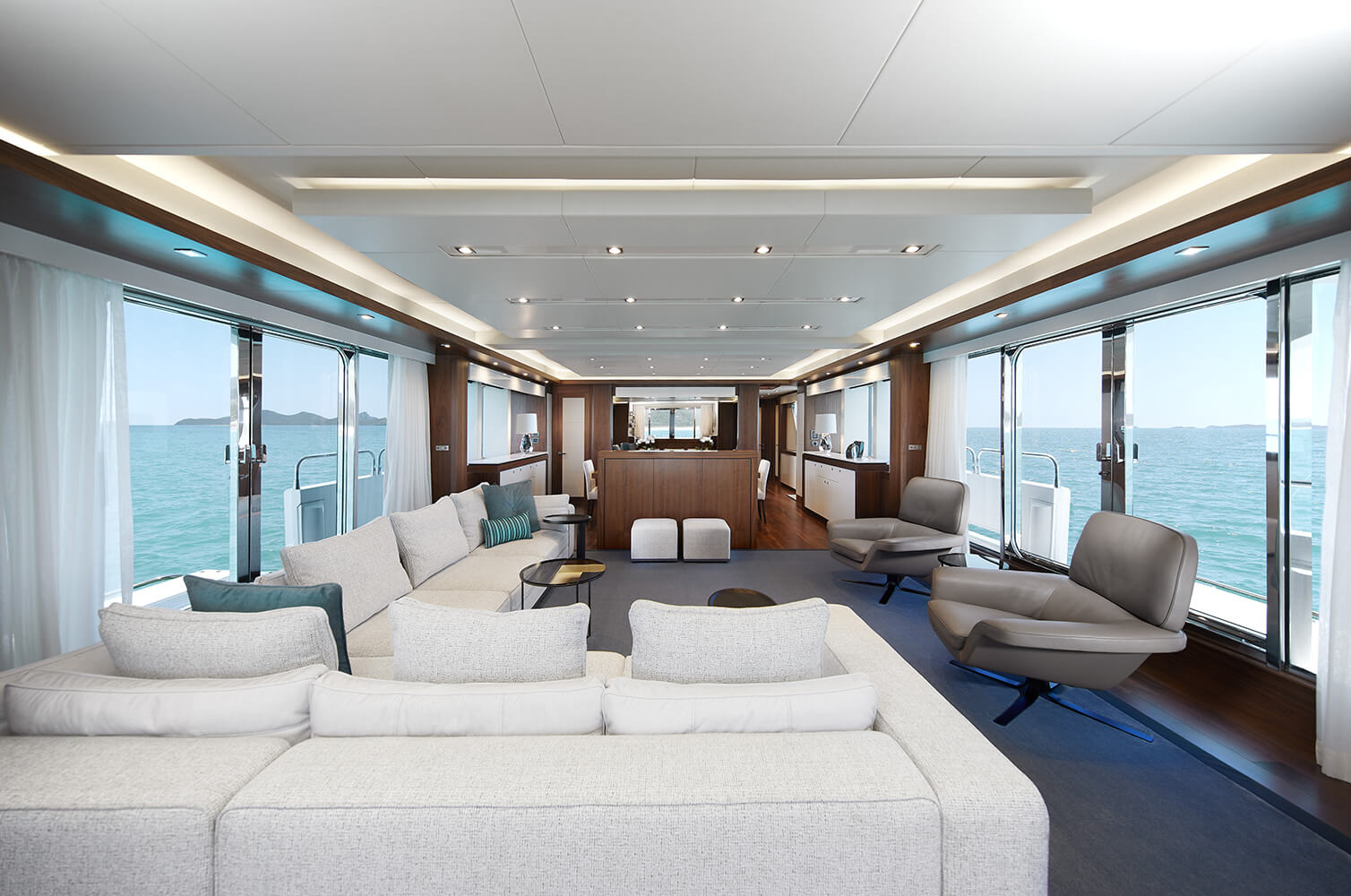 With windows and glass doors on three sides the main salon is a light and welcoming space. A comfortable lounge area is aft and offers oversized modular sofas and additional armchairs. Forward is a formal dining setting leading into the galley.