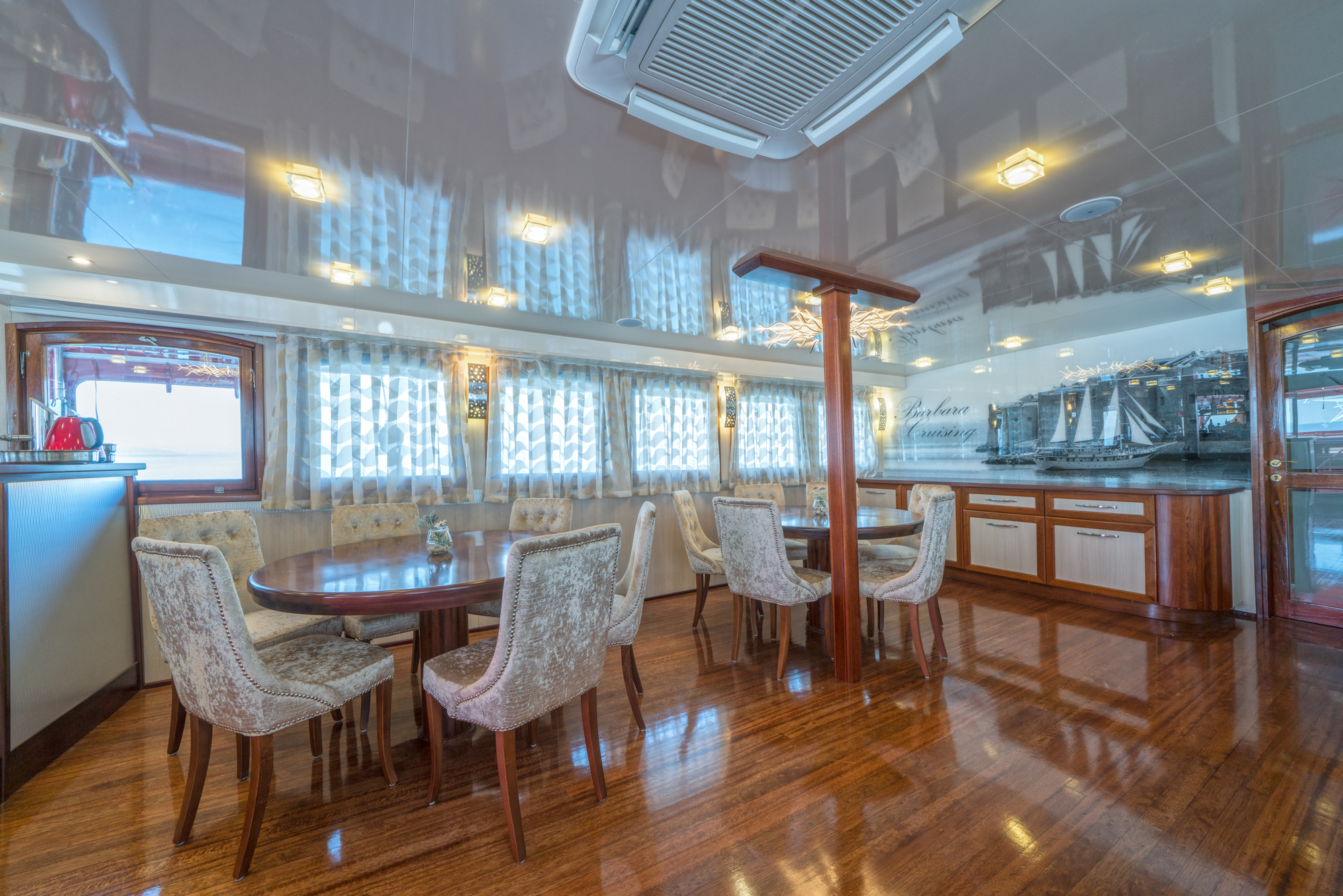 Aft on the upper deck is an elegant dining area sheltered under a soft bimini with a flexible set of tables and chairs which can be arranged as guests require. There is a large sun pad/day bed further aft, where guests can relax with a pre-dinner drink.