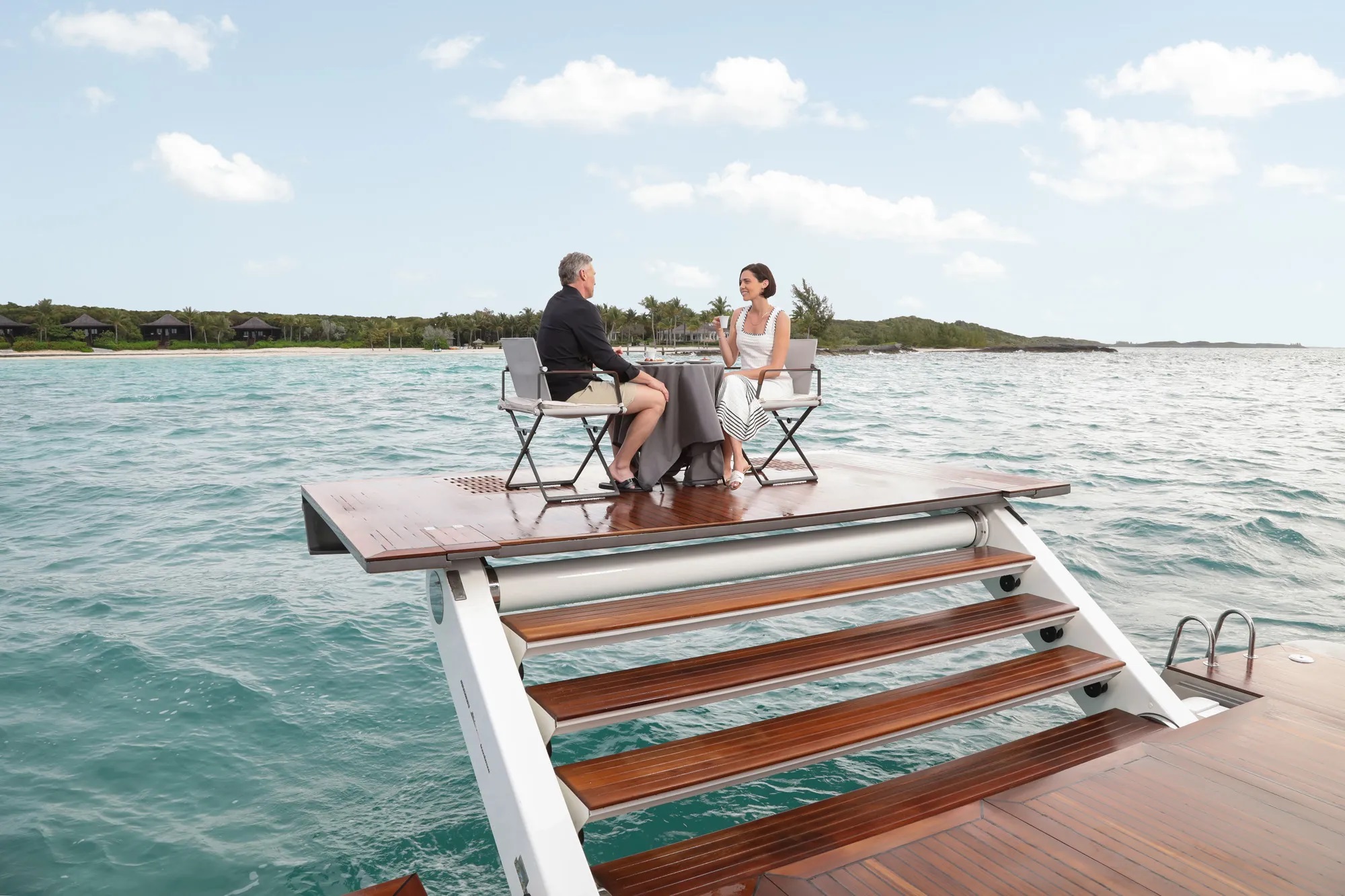 The main deck aft offer yet more sociable space and includes a dining table, bench sofa and additional chairs and steps leading down to the four-metre-wide Z-lift swim platform. The platform can be raised above or lowered into the water to suit and when the transom door is opened, a cosy beach club is revealed.