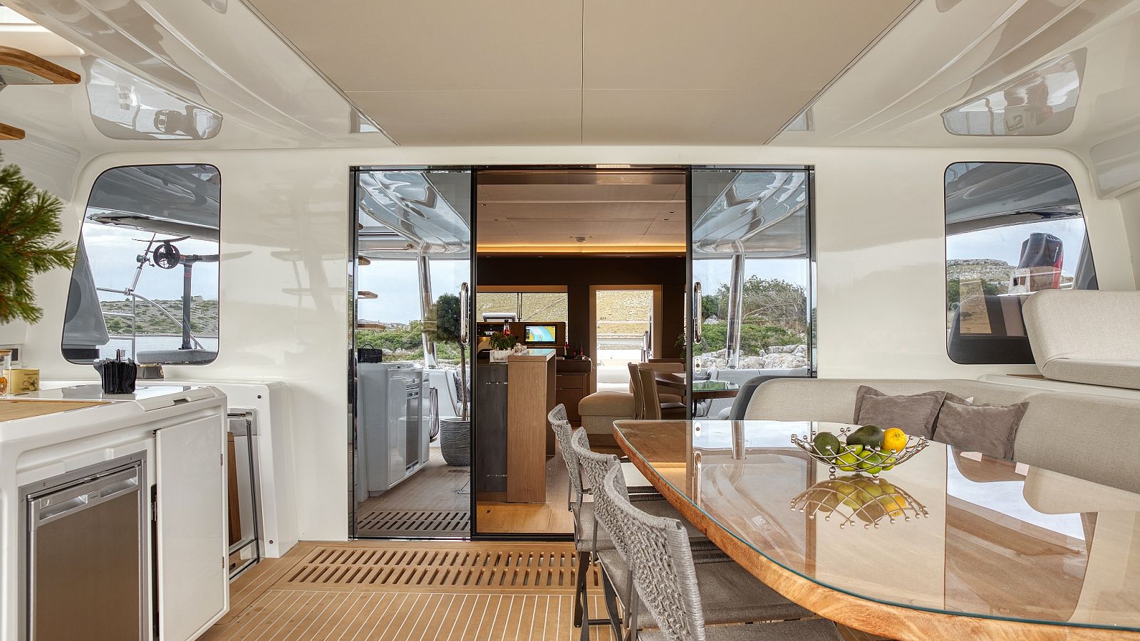 Wide gangways make access around the yacht very easy and safe and lead from the foredeck to the sociable aft cockpit. Here there is a corner dinette, adjustable sofa with can face forward and a sun pad.