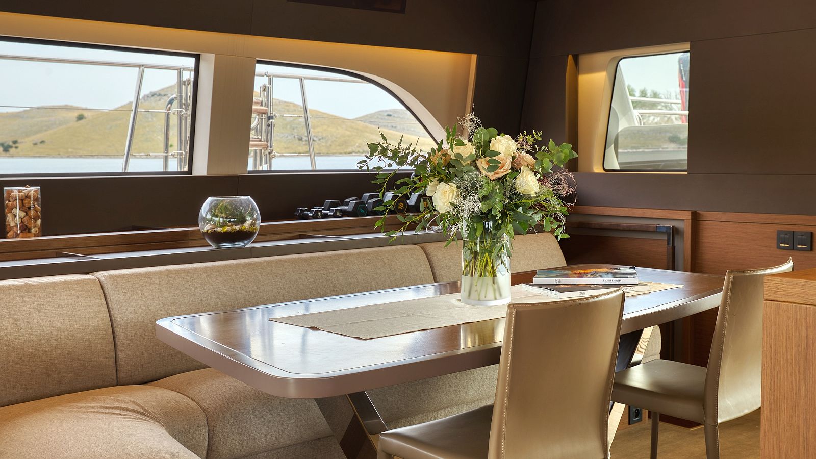 Generous exterior deck spaces and an open plan salon and galley create a luxurious and welcoming charter yacht with three crew members.