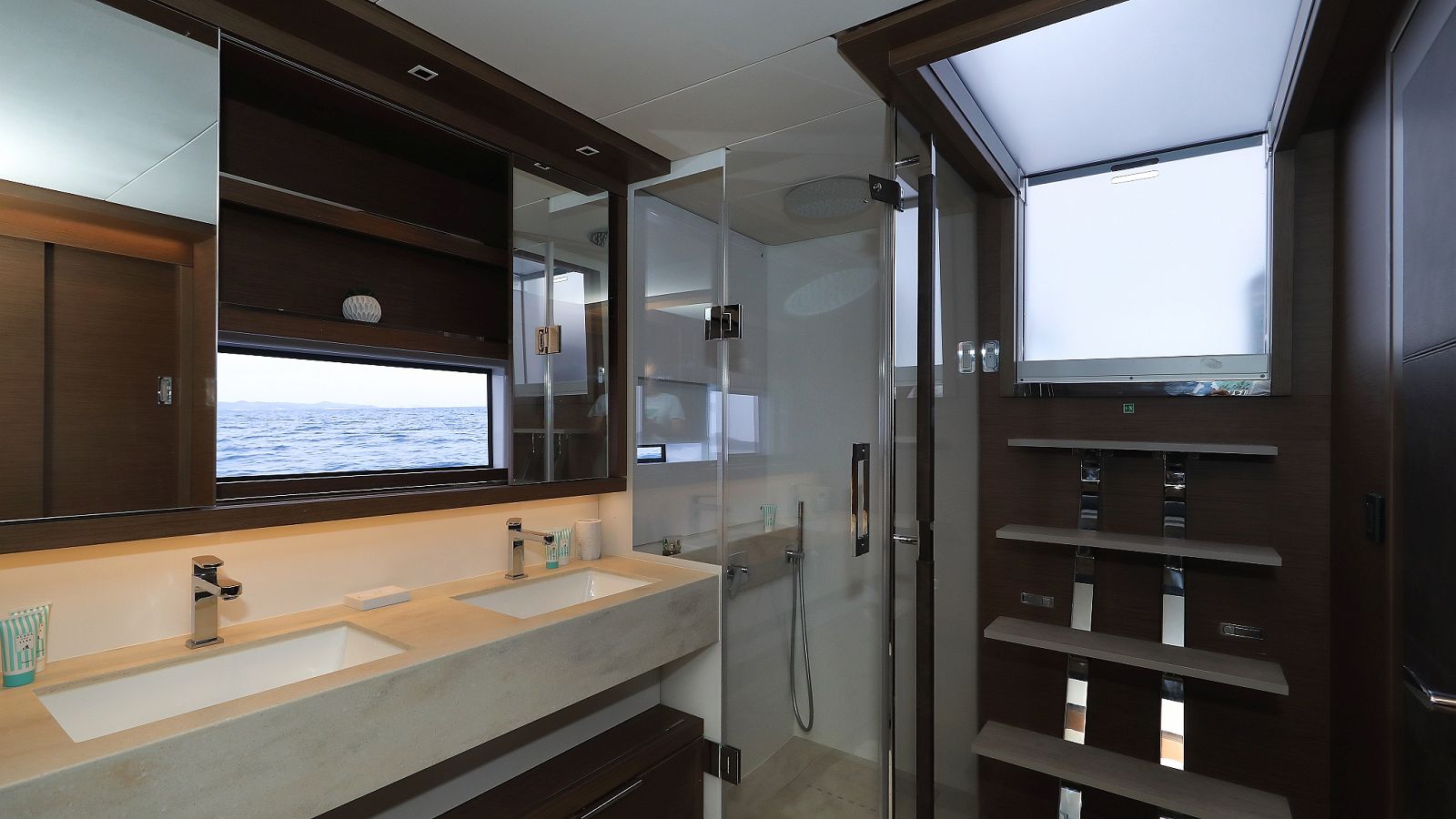 A master suite is forward to port and boasts a walk-around bed, seating area and luxury ensuite with direct access onto the aft cockpit. Three additional double suites also feature ensuite bathrooms. Tender and Toys