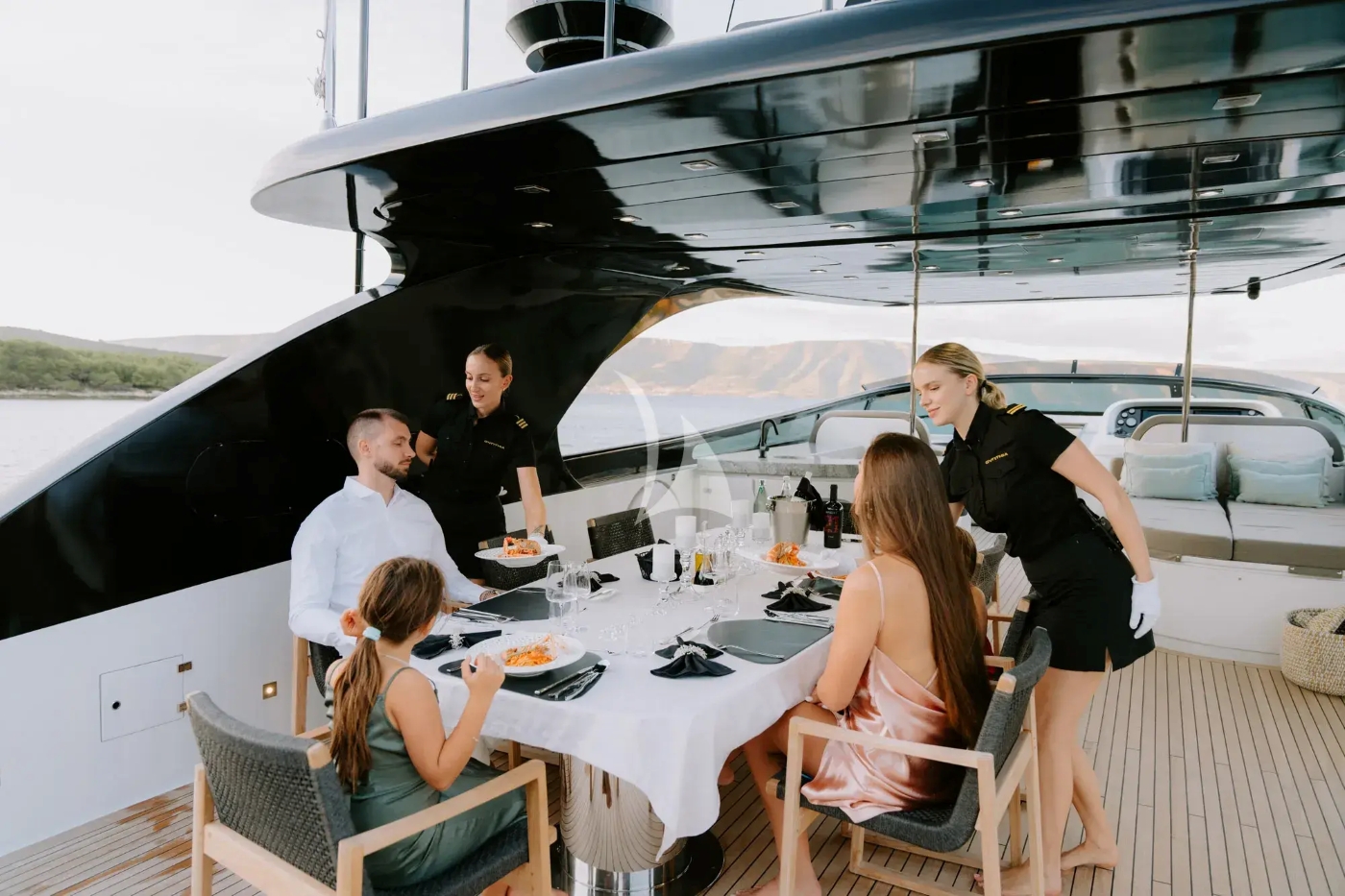 NOTABLE FEATURES OF CYNTHIA: ~Choice of al fresco dining ~Warm and welcoming interior ~Superior tender and water toys ~At anchor and underway stabilisers ~Gym equipment ~Air conditioning ~WiFi