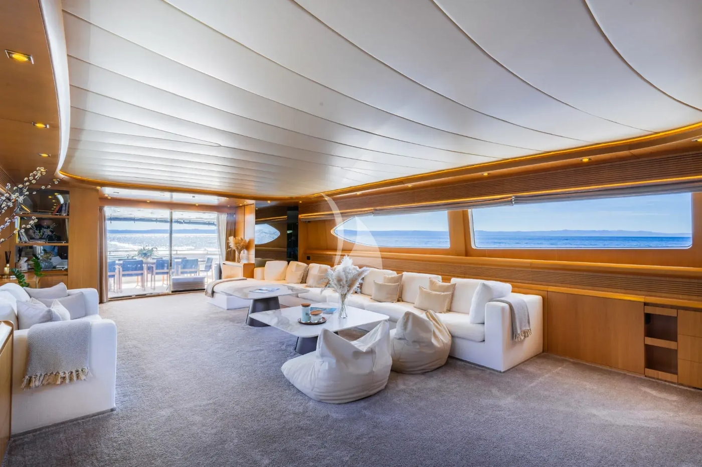 Warm wood panelling and neutral furnishings characterise the interior with the main salon boasting a very large modular sofa, pop-up TV and dining setting with glass table. Panoramic windows allow the light to flood in, and the lighting creates a relaxing atmosphere at night.