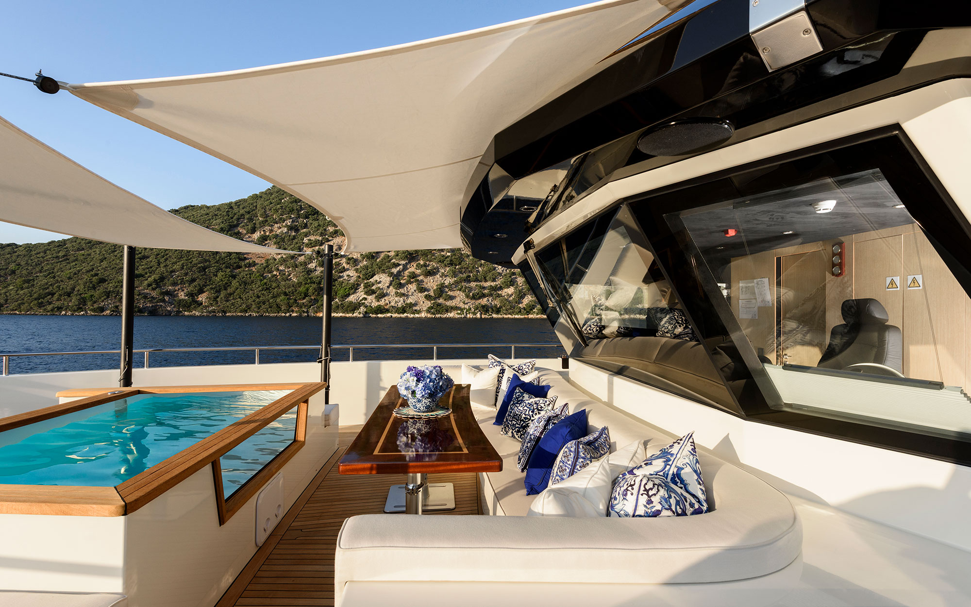 The explorer profile creates exceptionally generous aft decks on both the upper and main deck, plus a foredeck terrace.