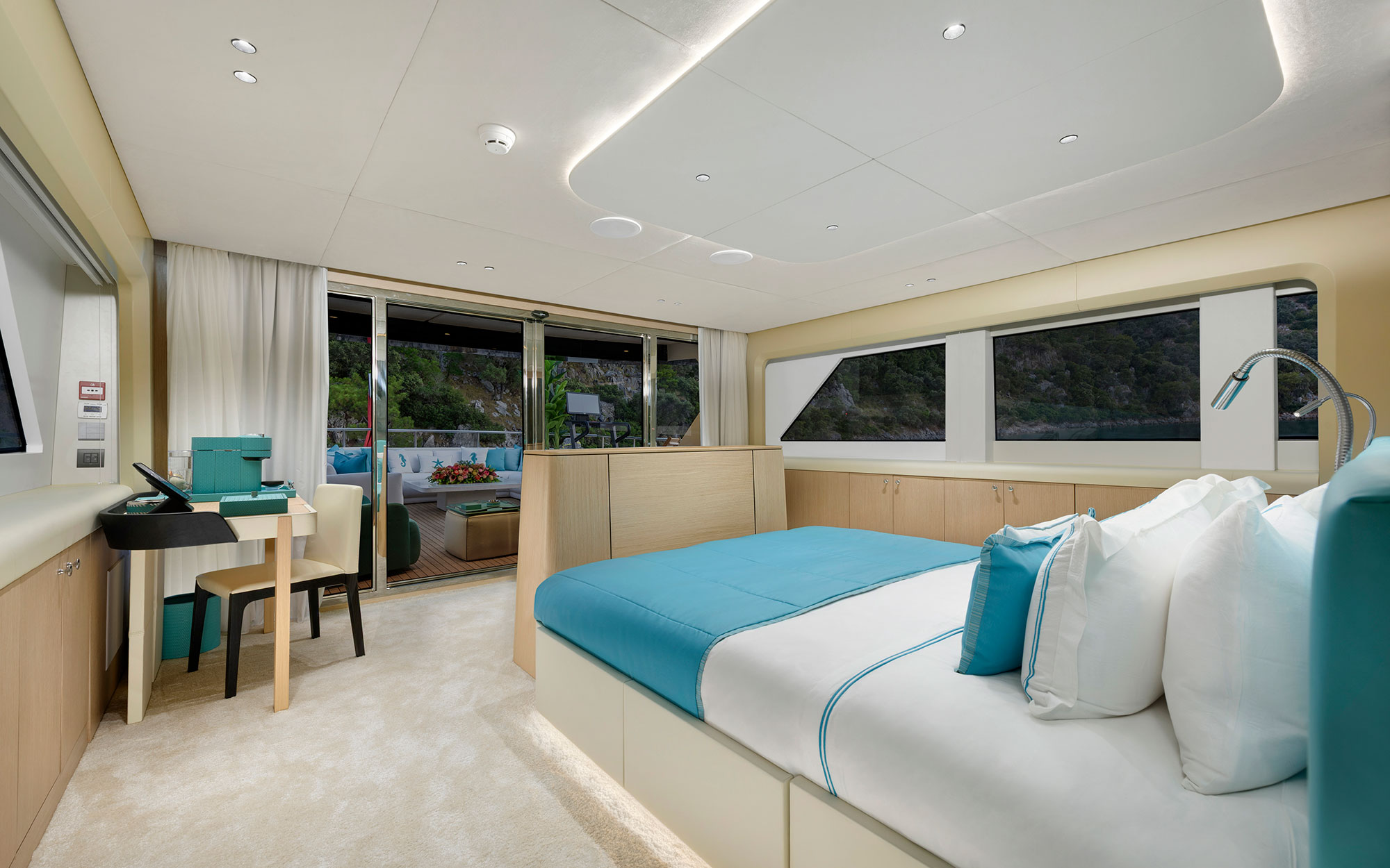 The upper deck master also benefits from doors leading to the upper deck terrace which can be used as a private space for primary charter guests. The lower deck is home to a VIP suite, a double and a twin, all with private and luxurious ensuite facilities.
