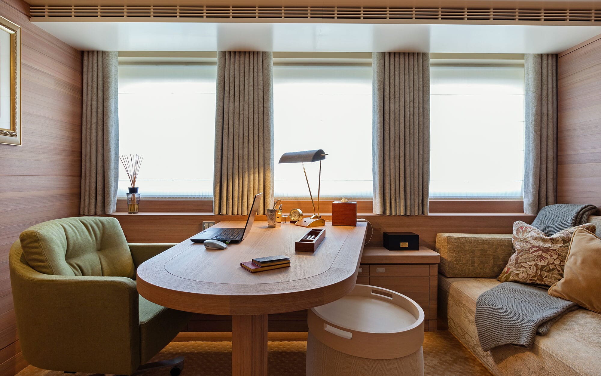Her beautiful and elegant interiors provide comfortable accommodation to up to 10 guests in 5 magnificent cabins, including a 61-square metre master suite, traditionally positioned forward on the main deck. The cabin has two separate dressing rooms, each with a private ensuite bathroom.