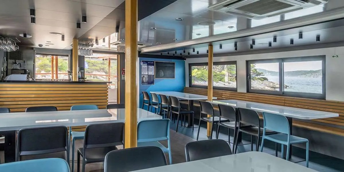 The upper deck features a spacious saloon and dining area, complete with a fully stocked bar.