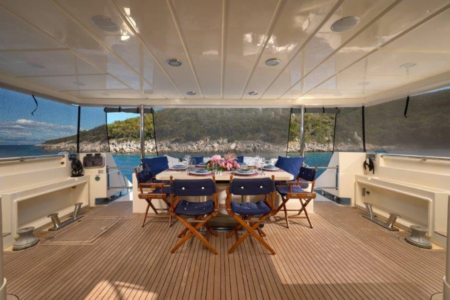 With an open sun deck and sheltered main deck aft, there is plenty of versatile al fresco guest space. She can accommodate up to eight guests in four suites who will be looked after by three crew members.