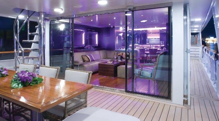 The fixed sunroof covers almost the whole upper deck, which can also easily be enclosed. There are 4 large sofas, wide enough even for sunbathing and 4 dining tables that can be lowered and folded to become smaller cocktail tables.