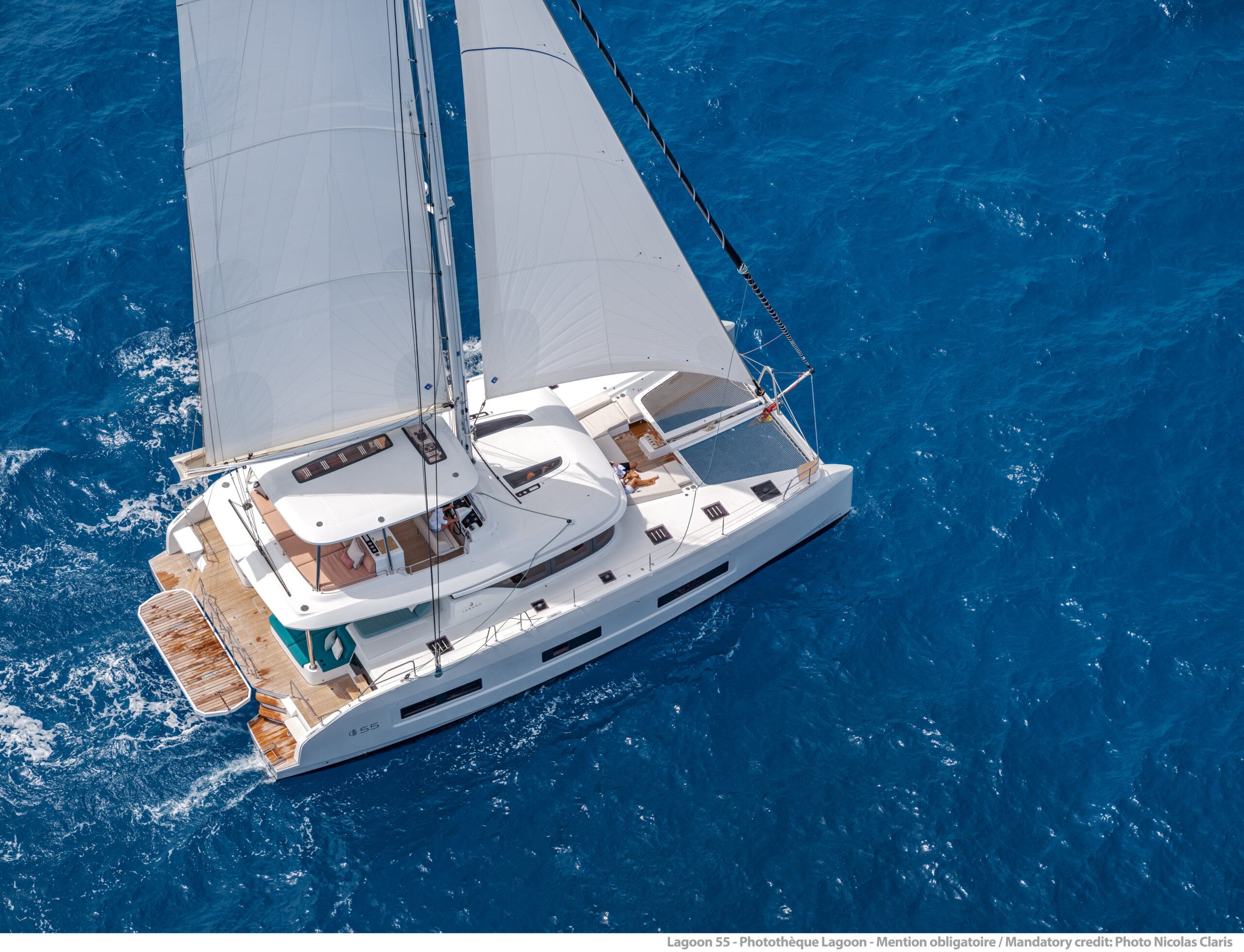 Lagoon 55 sailing catamaran POSEIRA was built in 2025 with a length of 16.56 m (54' 4") and accommodation for up to ten guests in five suites. The exterior layout offers a great al fresco lifestyle, while the light and airy main salon is a sociable open plan guest space.