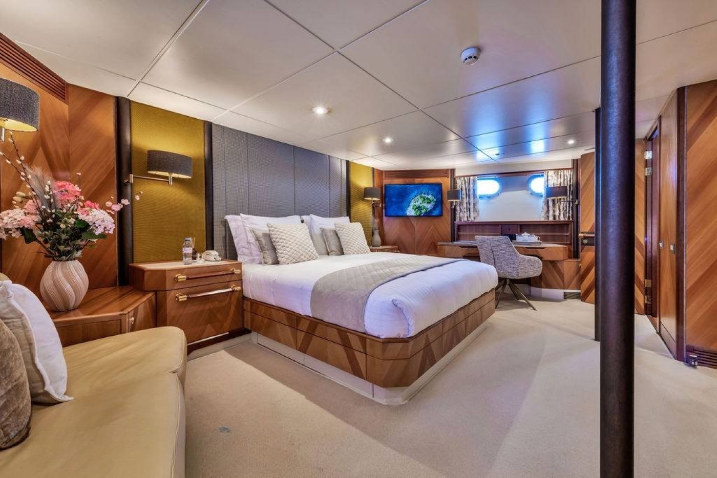 The upper deck aft is a multi-purpose space for tender and toy storage, al fresco dining and has a fitted sofa tucked into the bulkwarks. The main deck aft is a sheltered deck with a comfortable lounge and there are more sun pads on the main deck forward.