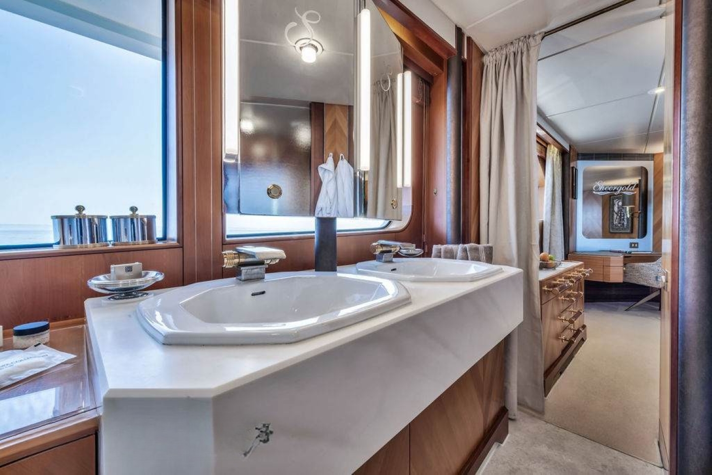 The elegant décor continues in the guest suites where warm inlaid wood finishes are complemented by brass, chrome and wood hardware on the cabinetry and in the bathrooms. Tender + Toys