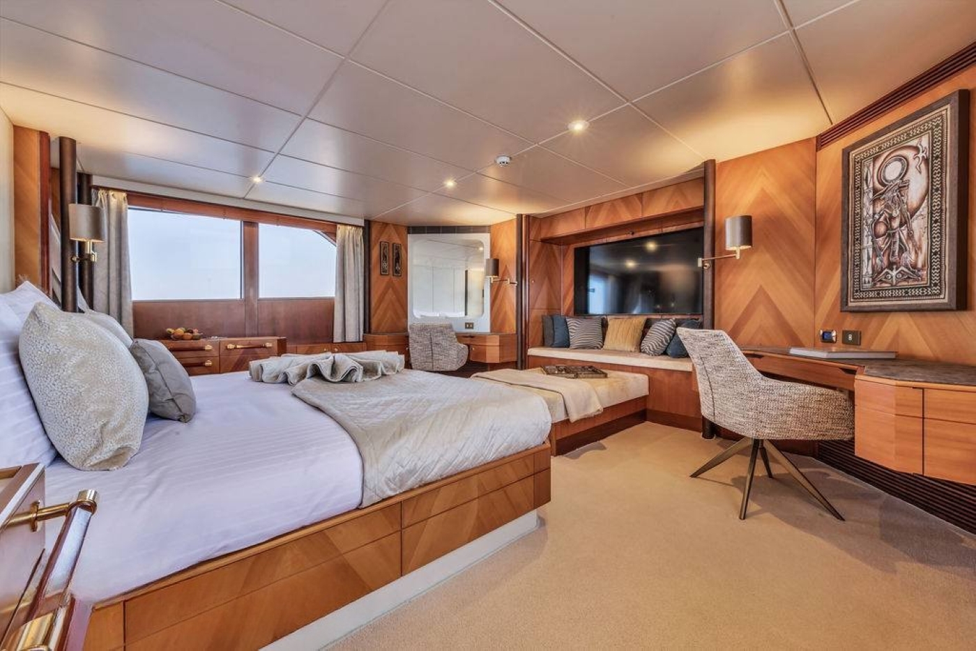 The elegant décor continues in the guest suites where warm inlaid wood finishes are complemented by brass, chrome and wood hardware on the cabinetry and in the bathrooms. Tender + Toys