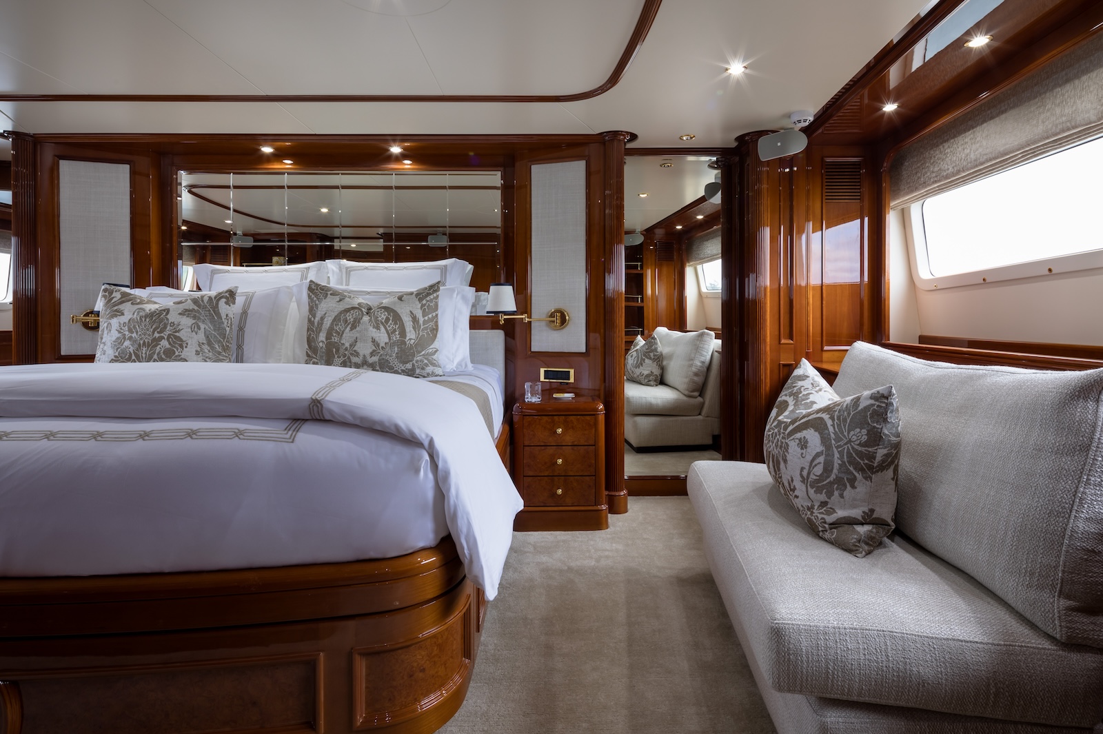 The main salon offers a spacious lounge, bar and semi-separate dining area and panoramic windows which flood the space with natural light. The sky lounge is a cosy space to enjoy small gathering or perfect for kids while the adults dine on the upper deck aft.