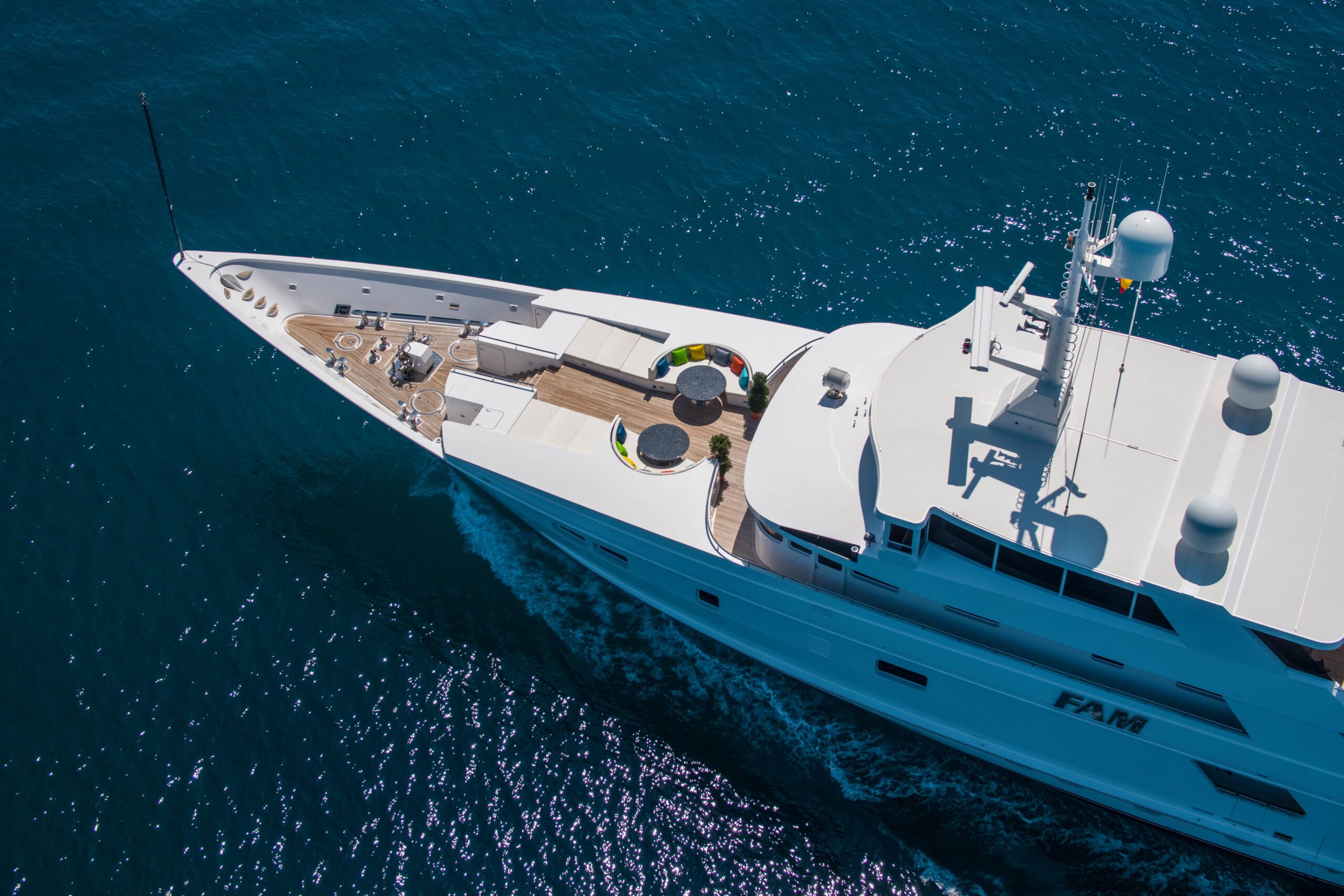 FAM): ~Striking design inside and out ~Sun deck jacuzzi ~Main deck master suite ~Great collection of water toys ~At anchor and underway stabilisers ~Air conditioning ~WiFi