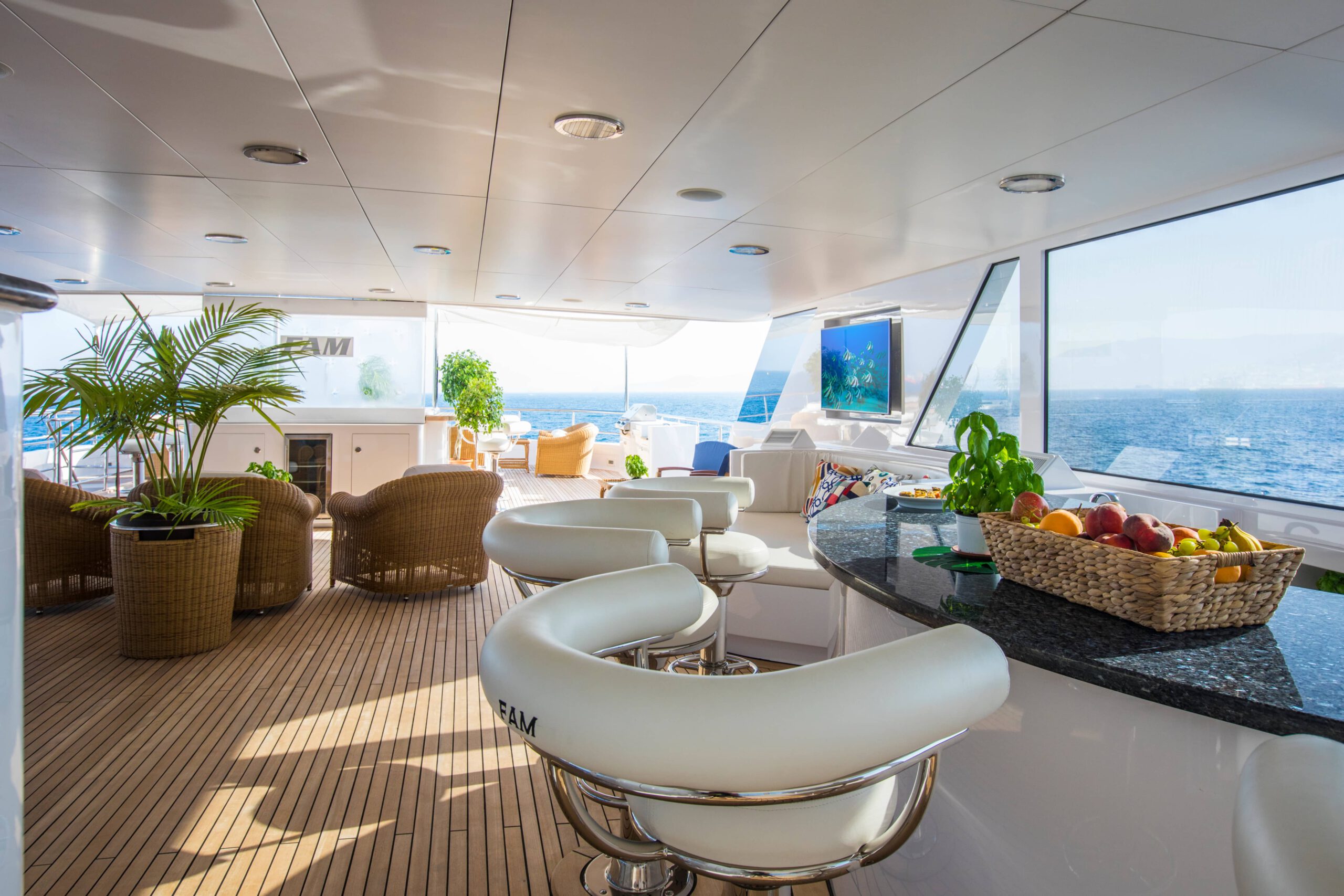 FAM): ~Striking design inside and out ~Sun deck jacuzzi ~Main deck master suite ~Great collection of water toys ~At anchor and underway stabilisers ~Air conditioning ~WiFi