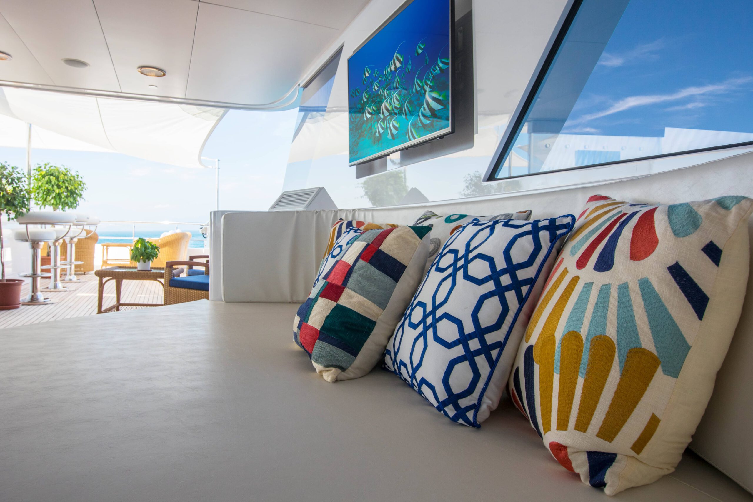 The fabulous sun deck is cleverly designed with an open aft area featuring a jacuzzi with sit up bar and an elegant lounge, and a semi-open zone with another sit up bar, seating and dining. The layout makes a flexible space perfect for family time or parties.
