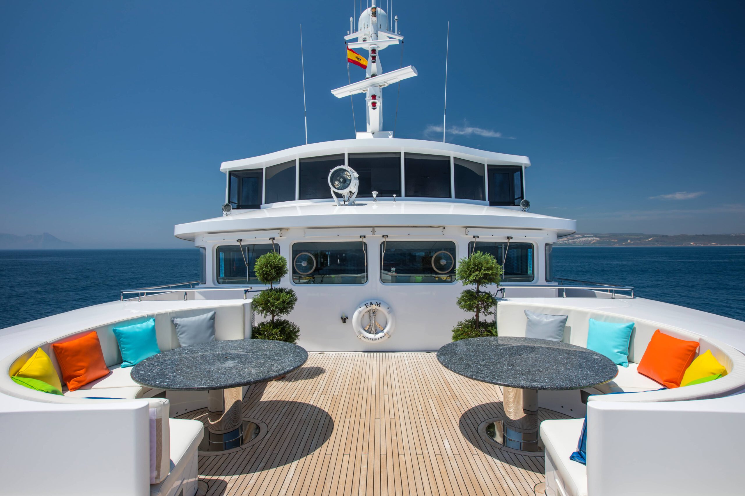 At the stern on the main deck level finds a terrace at the water’s edge with two built in seating areas.