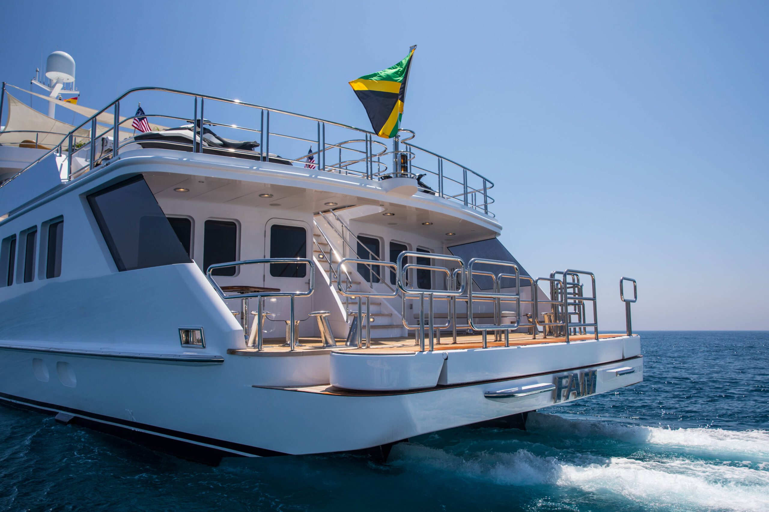 FAM): ~Striking design inside and out ~Sun deck jacuzzi ~Main deck master suite ~Great collection of water toys ~At anchor and underway stabilisers ~Air conditioning ~WiFi