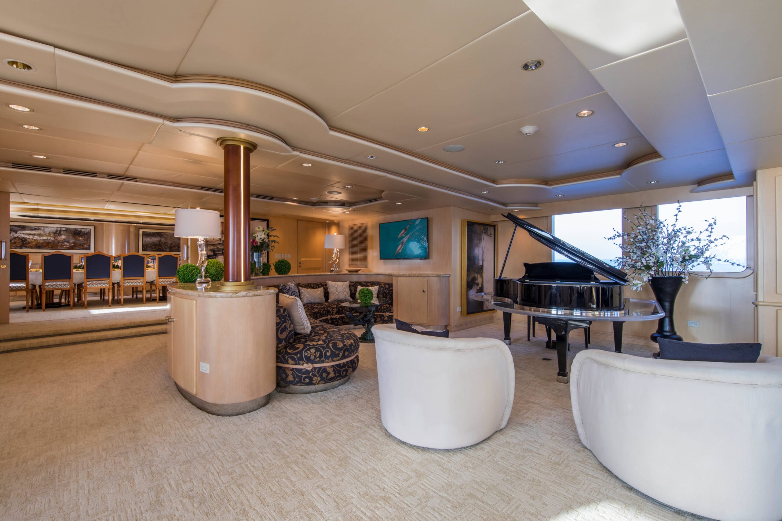 The main salon is vast and configured with a selection of gently curved built-in seating areas, armchairs and a grand piano making the perfect entertainment lounge.