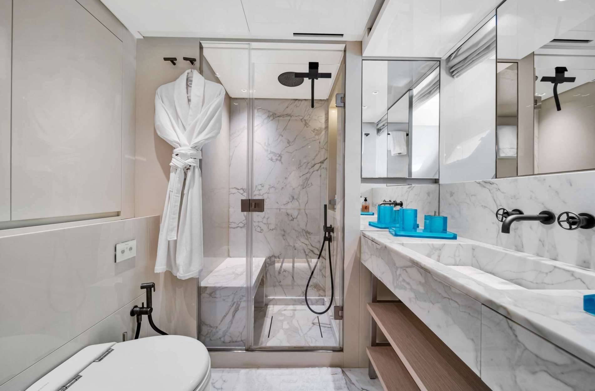 The master suite boasts a king-sized bed, seating area, desk and vanity plus a deluxe ensuite and walk-in-wardrobe. The forward VIP and two twins are light and airy and benefit from the luxury and privacy of ensuite bathroom facilities.