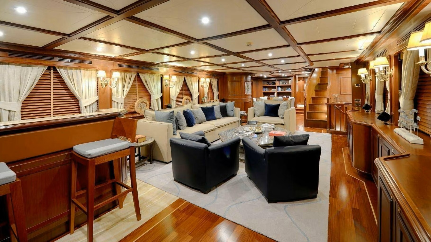 The comfortable and welcoming interior offers communal guest space in a sky lounge on the upper deck and salon on the main deck.