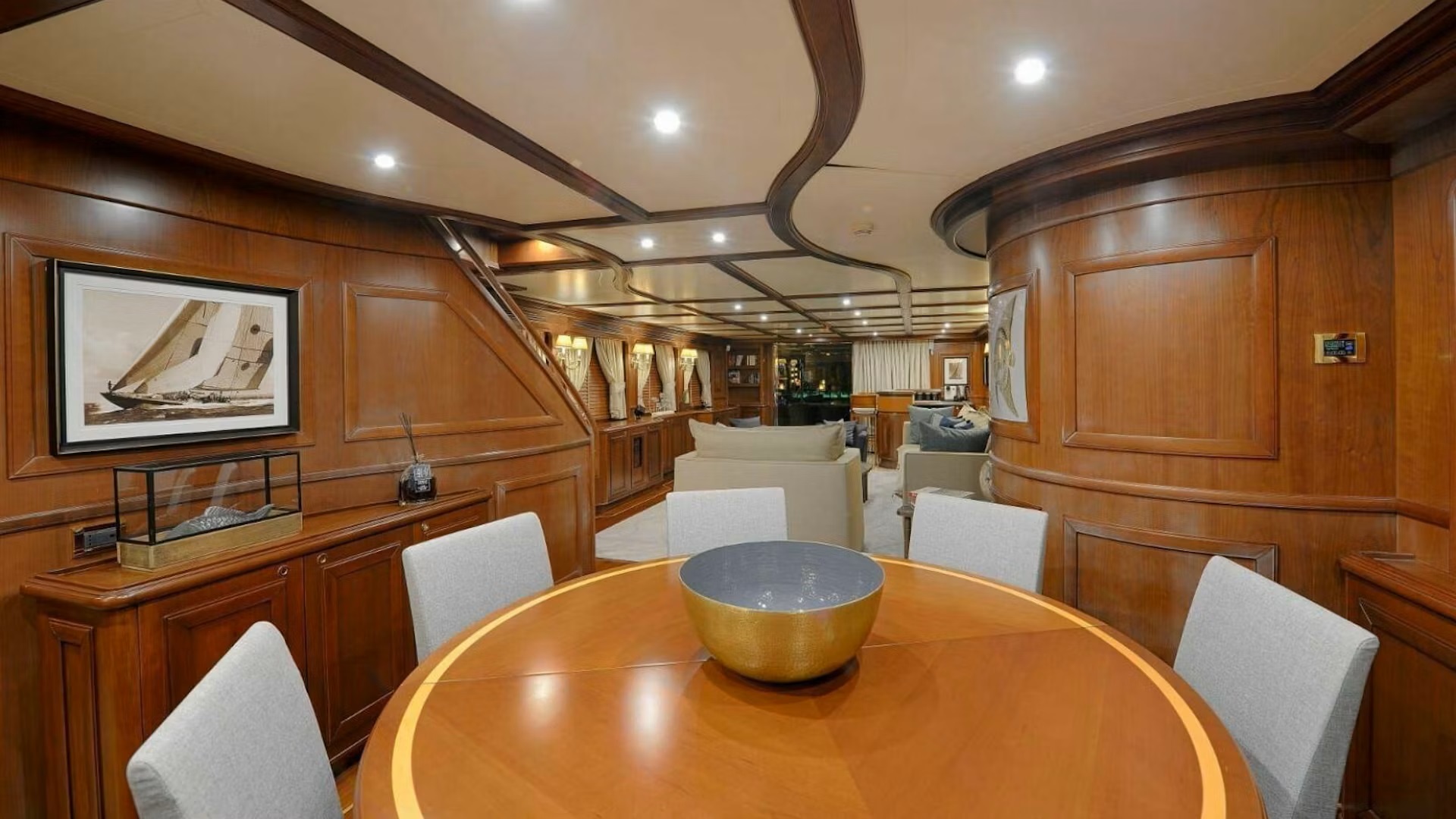 The main deck aft features another outdoor dining setting and a split-level beach club at the water’s edge.